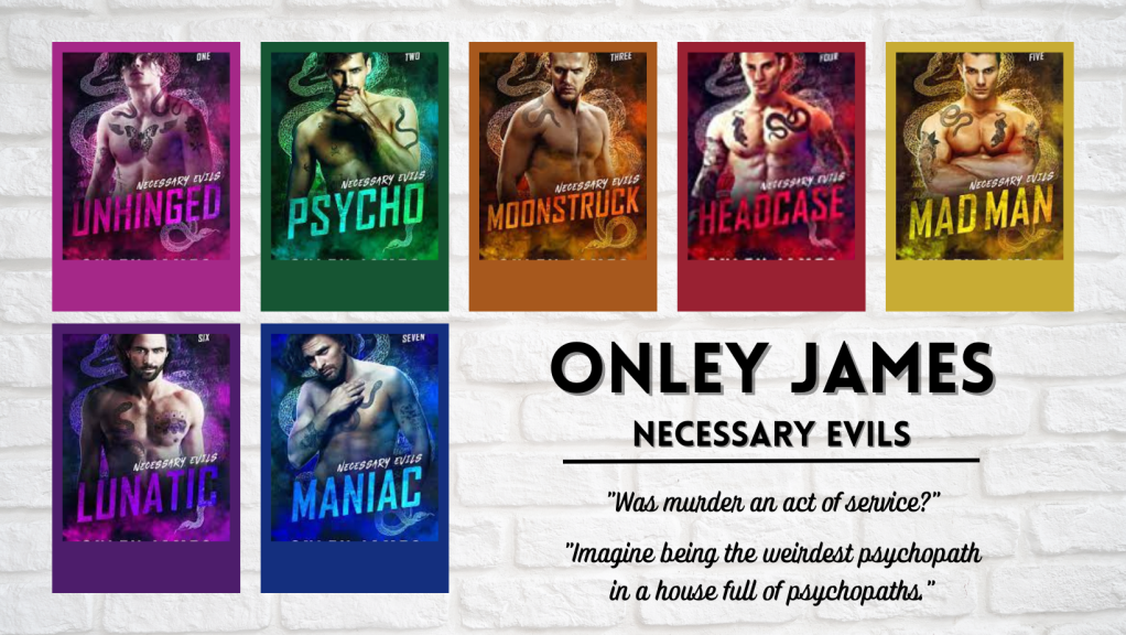Honestly, if the plot is good, I really don’t care who or what is falling in love. One of the series I absolutely inhaled and fell in love with is the Necessary Evils series by Onley James. Oh, those Mulvaney boys are something else. A family of murderous psychopaths led by one hot daddy himself, Thomas Mulvaney. Each book follows a different Mulvaney finding their significant other (all couples in these books are MM). And the Mulvaney boys do nothing by halves. Adam and Noah have a special place in my heart, as they are the couple from book 1 (Unhinged). And Thomas and Aiden just damn near break your heart in book 7 (Maniac).