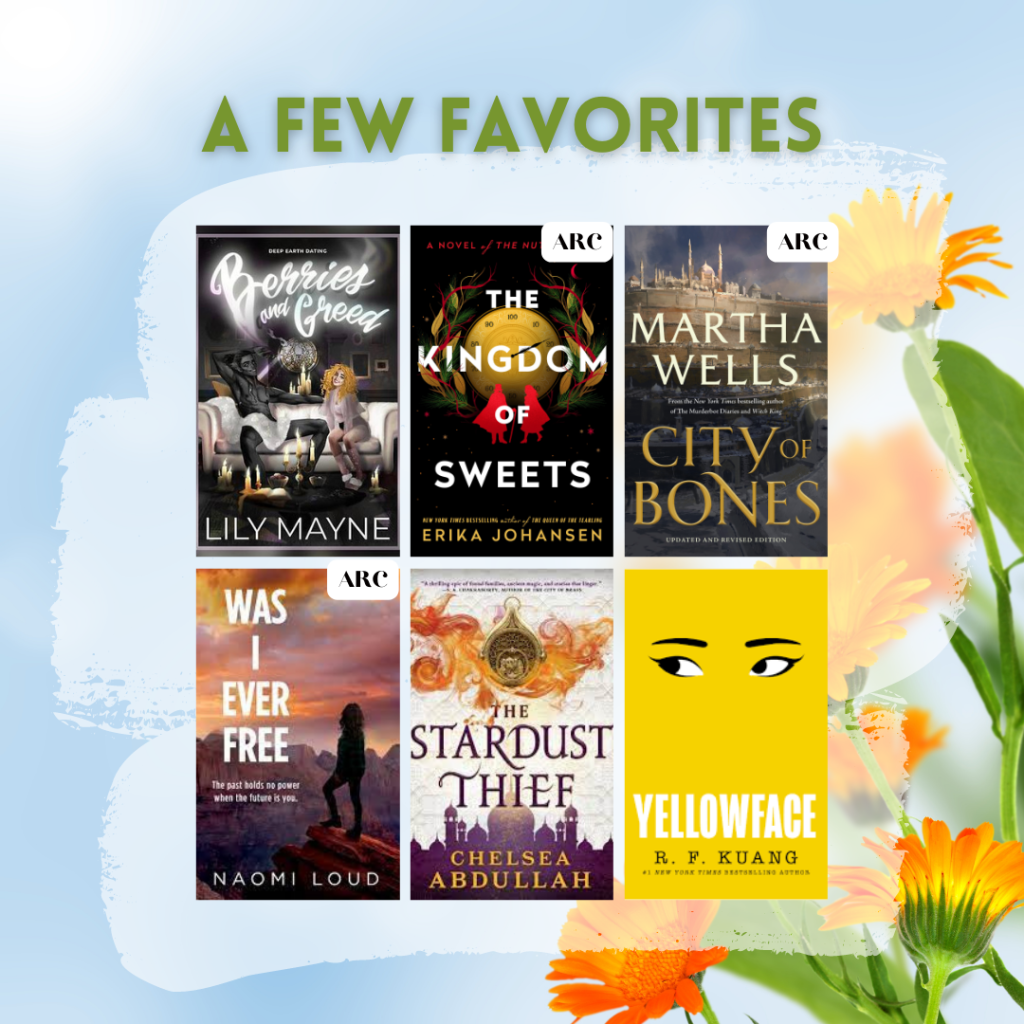 All of the books finished this month were (bolded titles are audiobooks): Done and Dusted // Prey Tell // Berries and Greed // Angel // Impact // His to Keep // The Christmas Deal // His Christmas Wish // His: Dominic // Tower of Dawn // His Dirty Demands // Kingdom of Sweets // Ink // His to Command // A Light in the Flame // Moonstruck // City of Bones // Was I Ever Free // Yellowface // Radium Girls // King of Pride // Ward // Headcase // The Stardust Thief // Traveling with Gentlemen // Kingdom of Ash // Sweet Vengeance // Behind the Net // The Anti-Hero // Grump Gone Wild // Grump Gone Bad // Whole Lotta Grump // Cruel Summer // King of Wrath