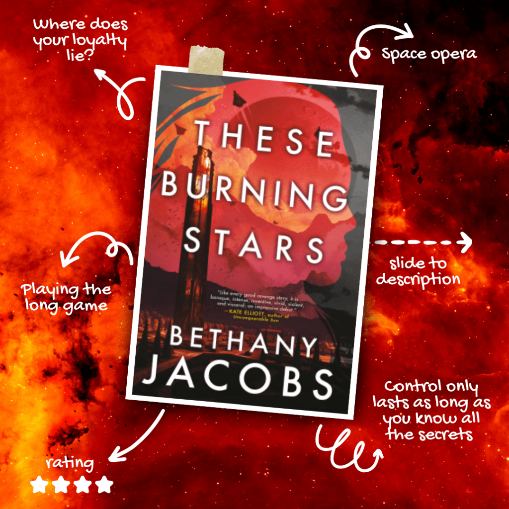These Burning Stars is a mix of space opera, political scheming, and mentor-student relationships (where the student quickly surpasses their mentor). Information is gleaned between barbed words and honeyed threats. The grip of an empire is maintained by tight control of information and resources (or is it?). Rebellion is licking at the edges of a planetary system rife with secrets and calculated moves.
