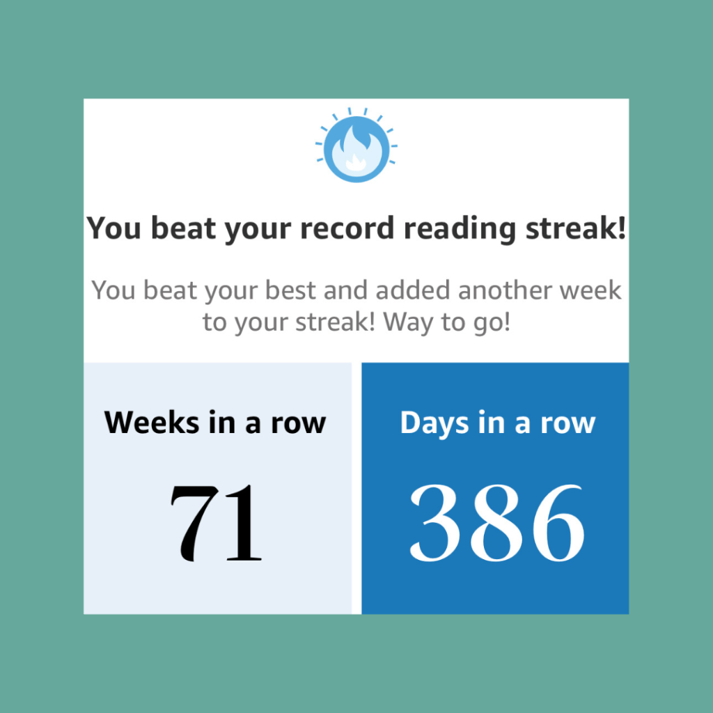 This was one of those things that I did not set out to accomplish. But somewhere along the way, I noticed that I had read for over 100 days in a row on my Kindle app. Naturally, I wondered how long I could go with it. As of now, I am at 386 days in a row. Once I hit 365 (a year), I didn’t actively look at the numbers anymore, but when I looked recently I saw that I am continuing the streak, no breaks yet. I’m pretty sure I can keep the week streak going, but now I’m just curious to see how long the daily one can make it.