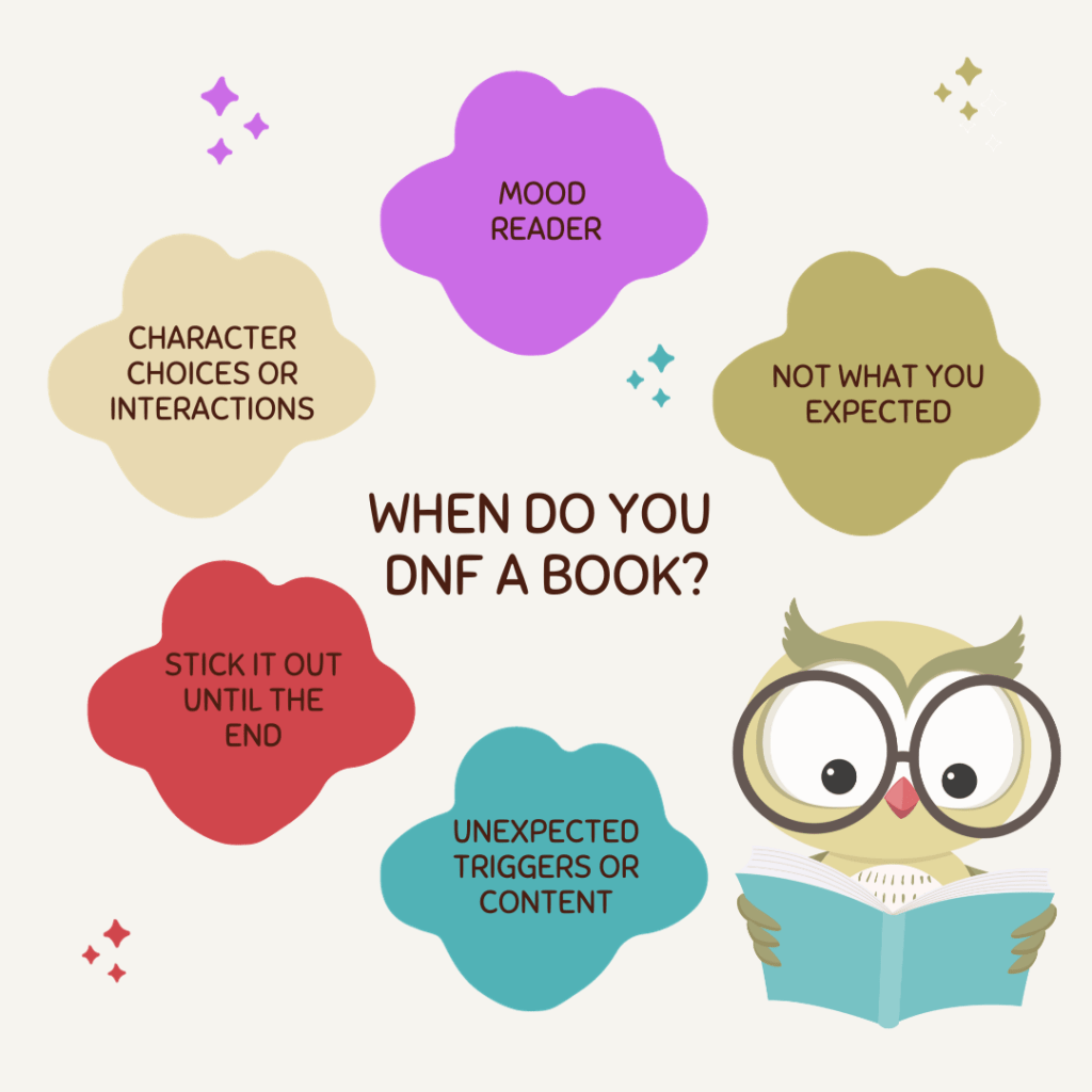 Most of the time, when I DNF it’s because either the characters do something that I do not condone personally, or the plot/pacing is SO SLOW that I keep falling out of the story. The book doesn’t have to be perfect for me to finish (I do rate a lot of books less than 3 stars, which doesn’t mean I hate them, just that they weren’t amazing, but had something in it that kept my interest enough to keep reading).
