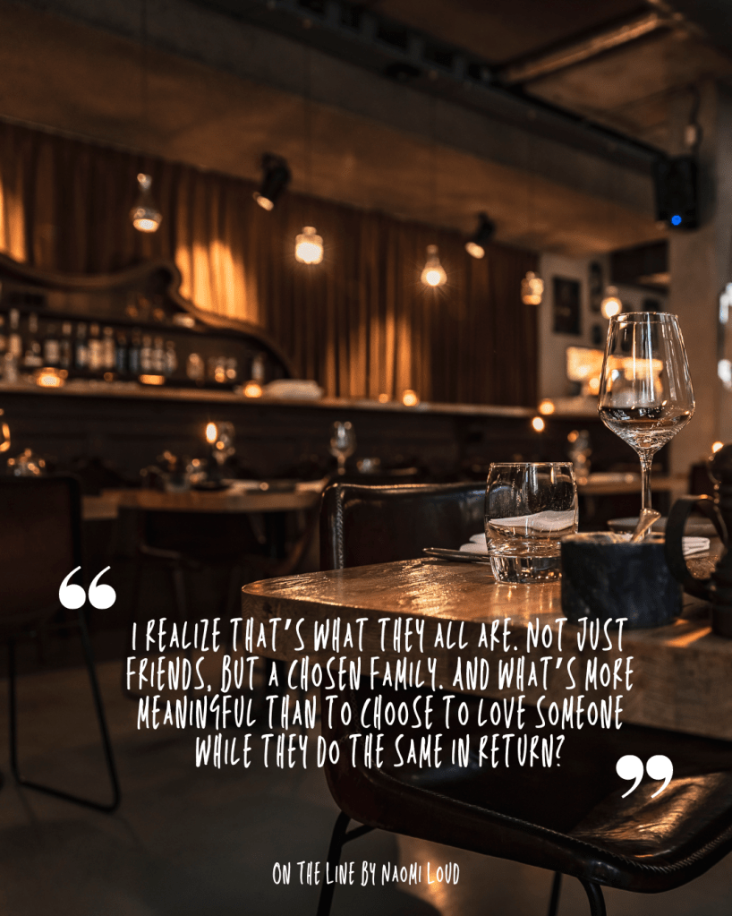 - I realize that’s what they all are. Not just friends but a chosen family. And what’s more meaningful than to choose to love someone when they do the same in return? (On the Line by Naomi Loud).