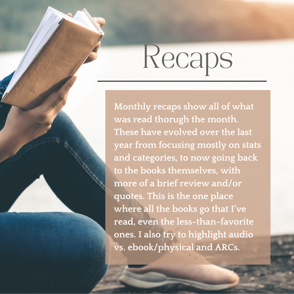 Not every book I read gets its’ own post. So, monthly recaps help me share all of what I’ve managed to read in a month. This is also where I can share any rereads as well. Each recap ends up taking on a bit of a different format, but I do love sharing the favorites and everything else.