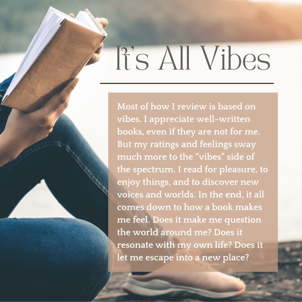 Most of the time, however, what I share is just “vibes.” Most of how I review books is also based on feeling much more than details and format. A book that clicks with me can get a higher review than one that maybe technically perfect, but did not steal a piece of my soul.