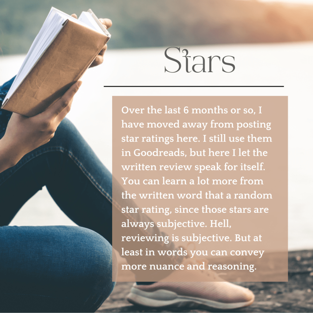 As far as reviews go, overall I’ve moved away from star ratings on any platform other than Goodreads/Netgalley (where they are *somewhat* required). I can convey more with my own words how I felt than a star rating ever could. Because sometimes there are “3 star” books that I love and reread. I compared it before to food. Food can be delicious and fun, but maybe isn’t the best thing I’ve ever eaten. Doesn’t mean I didn’t enjoy it though, and wouldn’t eat it again. Same goes for books and stars.
