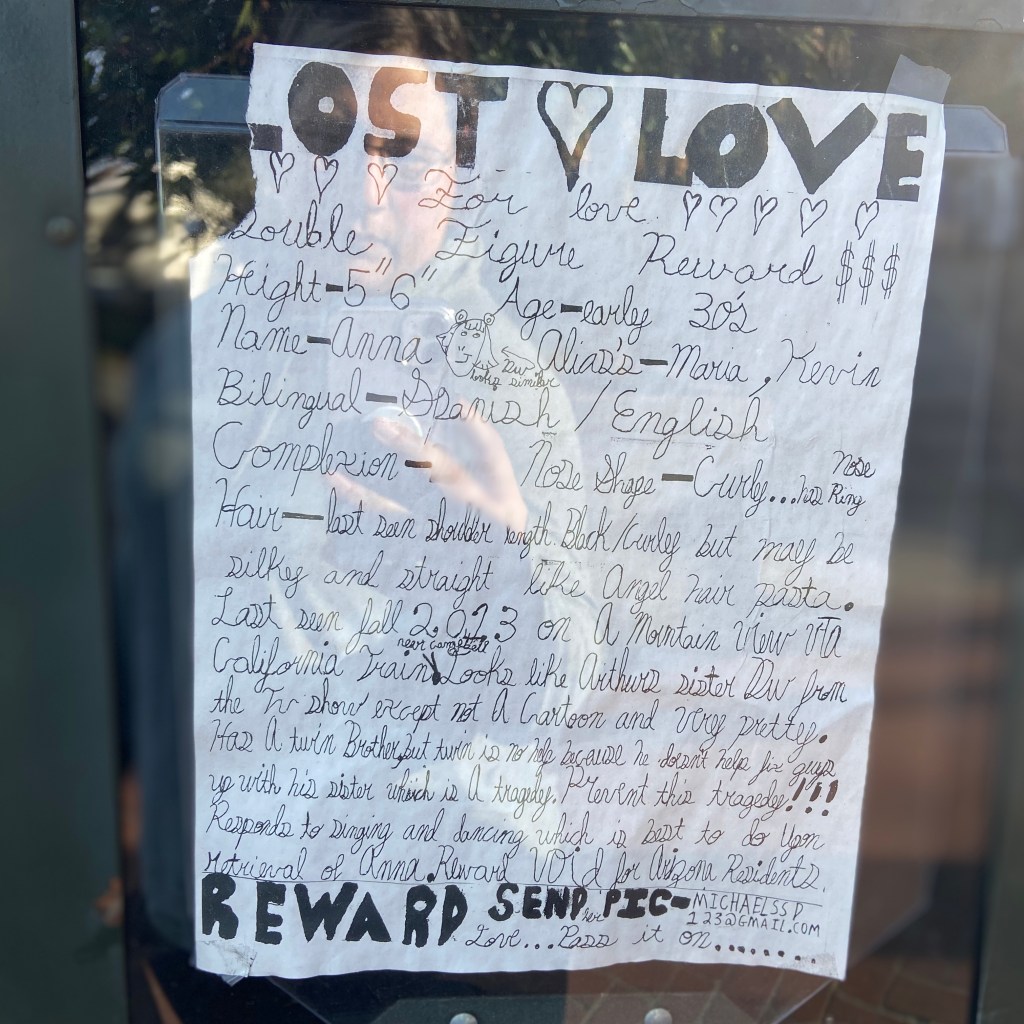 Years ago while on a vacation in San Francisco, while walking near the water, I saw this sign plastered to a newspaper stand. It was a “lost connection” sign, like those ads that you used to (still do?) find in the classified section of newspapers or on Craigslist (which I just checked, still exists!). The date on here says 2013, and I saw this in winter of 2019. Signs like this make me want to come up with a story, a second-chance romance. Although I am curious as to why Arizona residents were void for the reward…