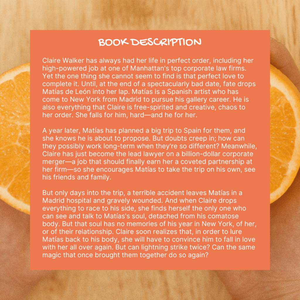 Matias and Claire give us an opposites-attract, second-chance romance (with a hefty dash of magical realism). It is a romance where Claire is the buttoned-up professional who has to have everything in order and doesn’t want to take unnecessary risks. Matias is a chaotic artist who embraces life and new things. They “meet cute” at an art gallery, and quickly find themselves in a relationship. Their relationship ends up being tested by tragedy when Matias has a life-threatening accident on a trip back home to Spain, Claire has to do what initially seems like an impossibility – make Matias fall in love with her all over again. Except this time, his life (and their love) is on the line.