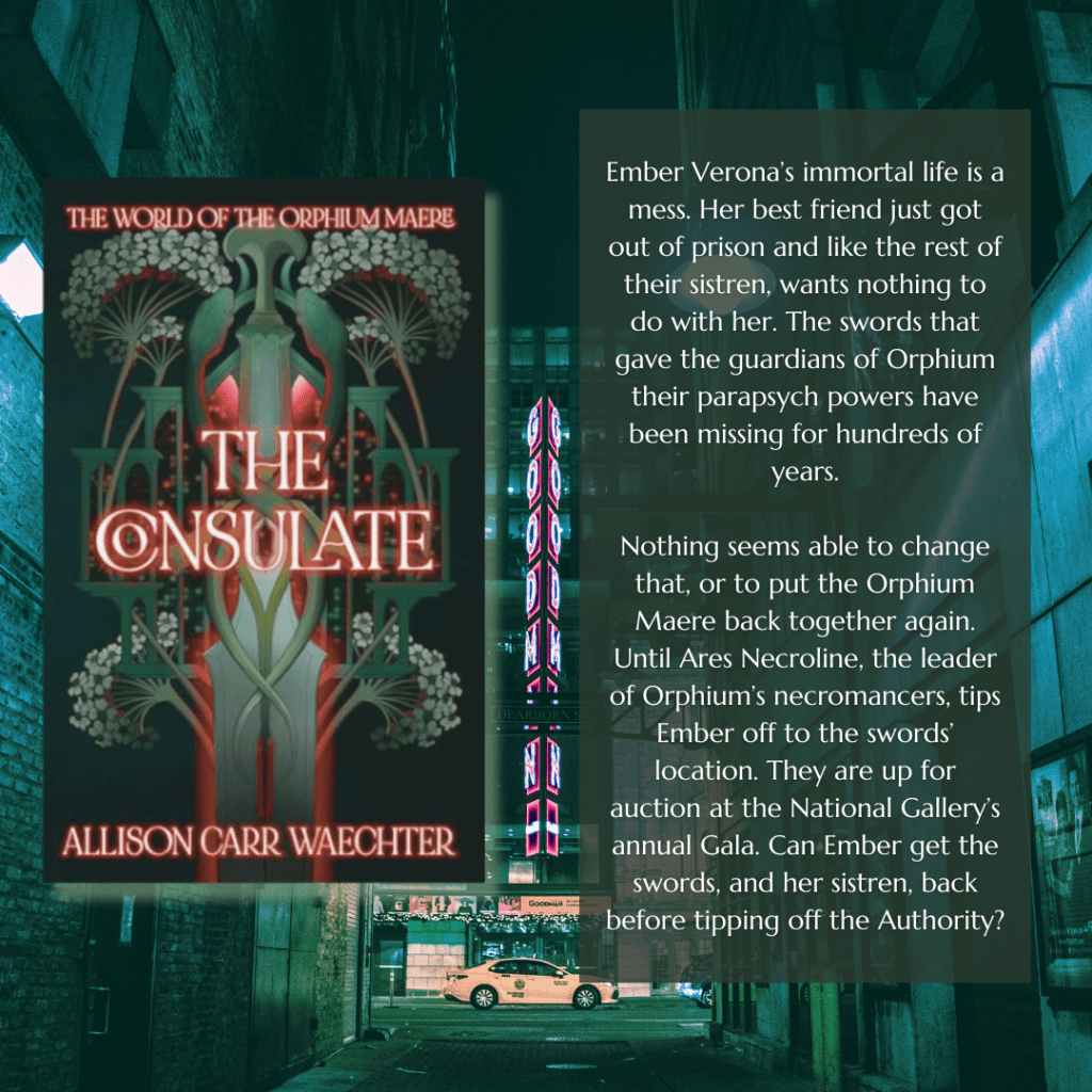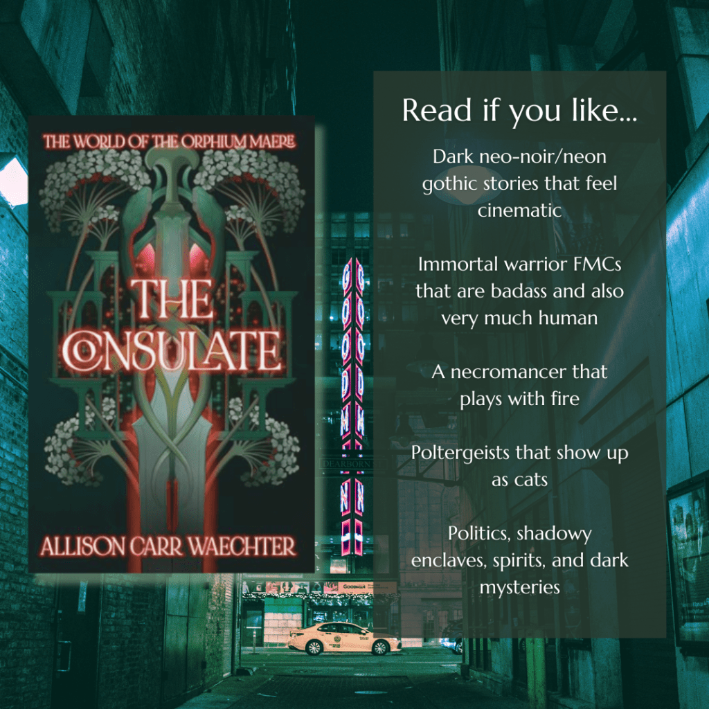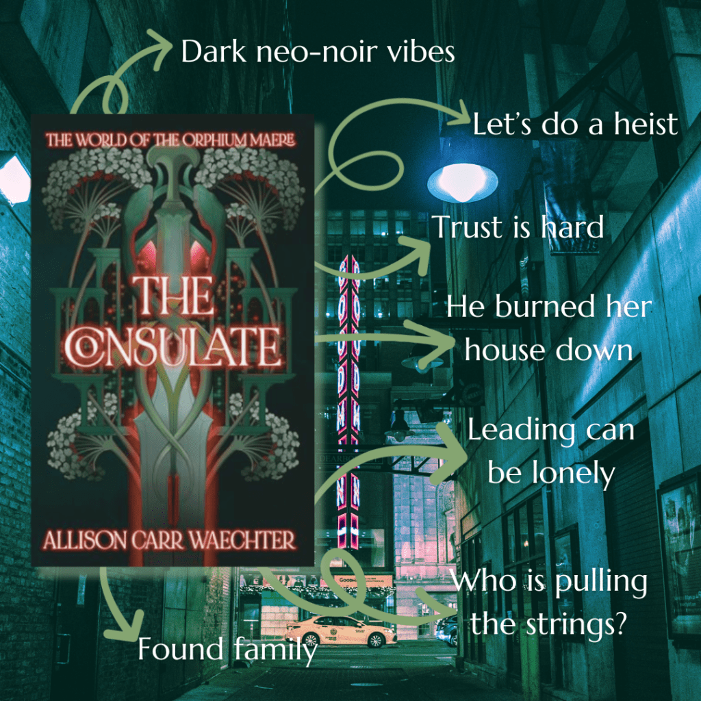 I’m not sure that I have the right words for how much this book made me feel, and for how perfectly this world fits within everything that I love in terms of setting. The Consulate is set in a time and place that reads as neo-noir, a little bit neon gothic and urban fantasy, and also full of eldritch monsters and paranormal spirits. There is grit and darkness to Orphium, a feeling of time and the weight of heavy sadness and guilt. But by the end of this book, there is also hope.