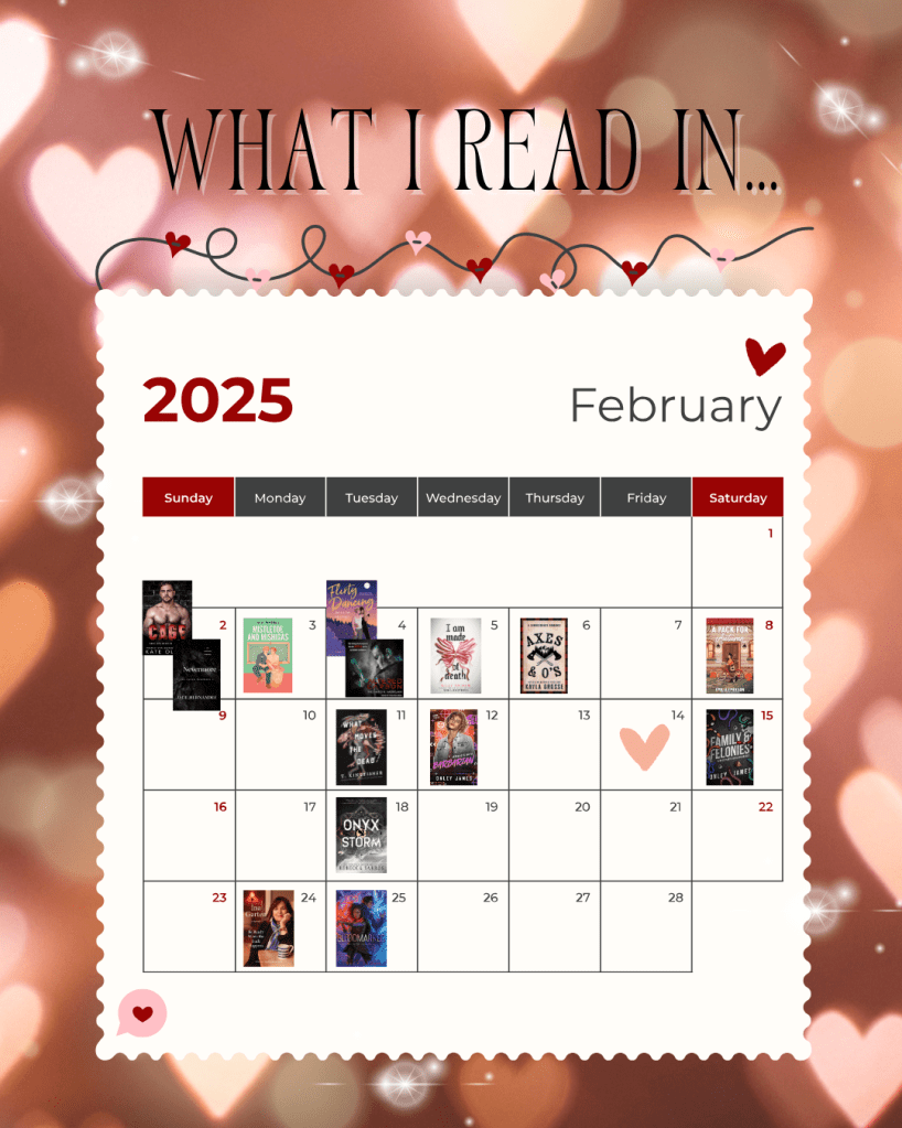 I did something a bit different with the image this time, and went for a calendar approach. Apparently, I like finishing books on Tuesdays. And the first week of February was full. Bloodmarked was by far the favorite of the month (I have Oathbound on hold at the library right now). And What Moves the Dead was delightfully creepy. I was less excited about Onyx Storm. That series is starting to feel a bit like the Blood and Ash series to me – overly long and a bit repetitive, but I’m now in it for the long haul. I think it’s because of the dragons.