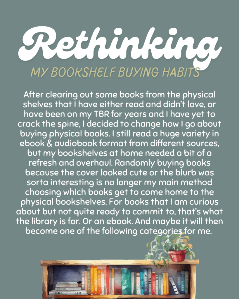 As much as I would love to buy every book ever and live in a library, that is not physically or financially possible at the moment. Maybe ever. So, I’ve had to take stock of my book buying habits – as they pertain to physical copies of books – and make some changes.