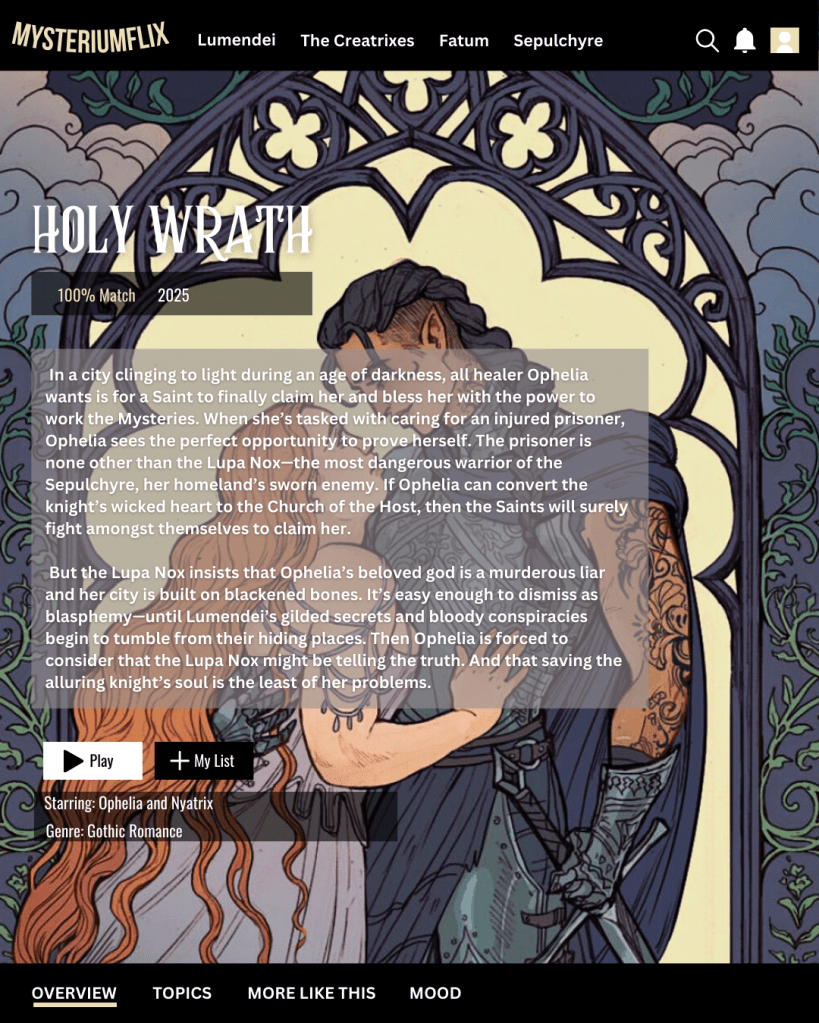 Ophelia has lived her life as a foundling, with an injured leg from childhood that gives her constant pain – a reminder of how different she is from everyone else in Lumendei – living under the grace of the Church. All she wants is to be able to take part, be able to use her gifts to save souls and bring them to the Church that saved her. She is engaged to Renault, an Apostle from a higher family. And yet, she yearns for more. When a warrior from the Sepulchyre is captured, it is Opehlia that has been tasked with her healing, and converting her to the Church.
