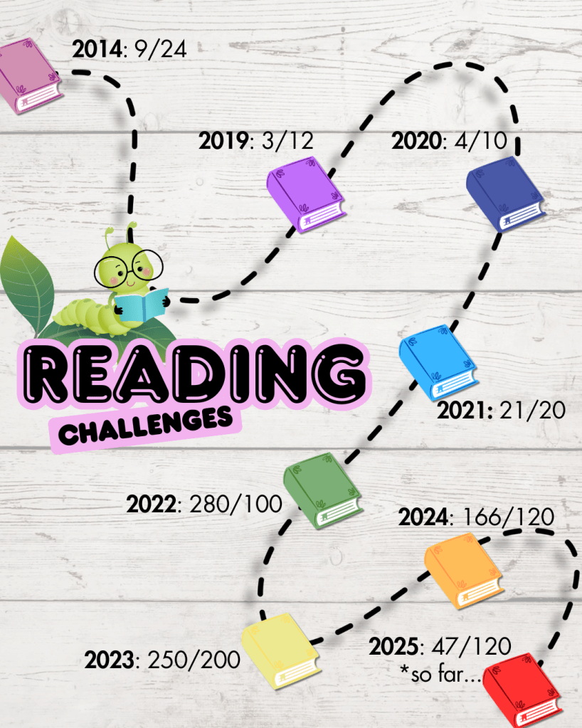 2021 was the first year I made and met a challenge goal. 21 of 20! Yay, me 🙂 in 2022 I read 280 of 100. 2023 had 250 of 200. And 2024 had 166 of 150. I had a bit of a reading renaissance after 2020. Those lists are too long to type out here. But I will say that 2022 was the year I found Kindle Unlimited, the Libby App (for my library), and a renewed love for the romance genre.