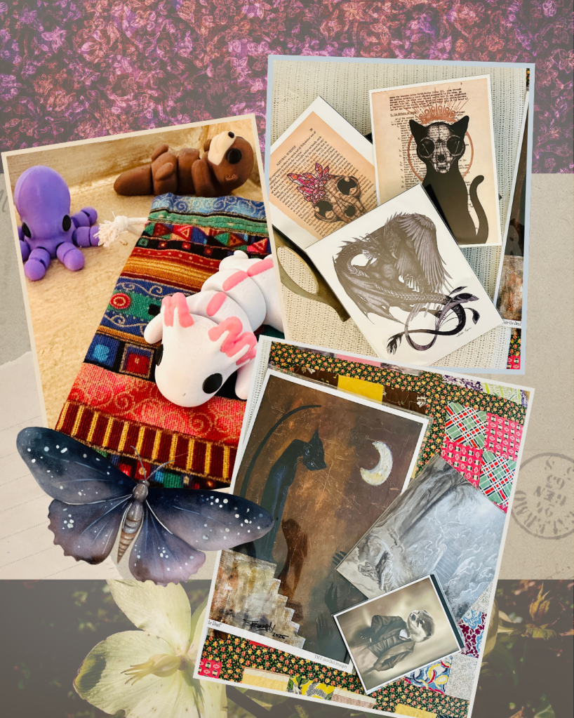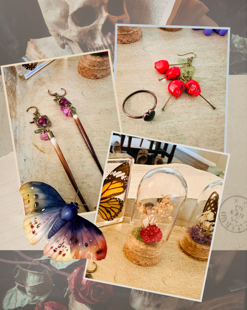 I ended up buy way more than I planned on (budget, what budget?). Some porcupine quill earrings, a ring, and my favorite purchase of the day — cherry skull earrings. I also got a couple of small terrarium domes, a resin monarch butterfly, a lot of artwork, and some cute mini 3D printed figures (otter, axolotl, and octopus). I have some display boxes on my walls now, so the minis fit perfectly there. And the artwork has gone up on the walls (I’ve created a gallery of sorts).