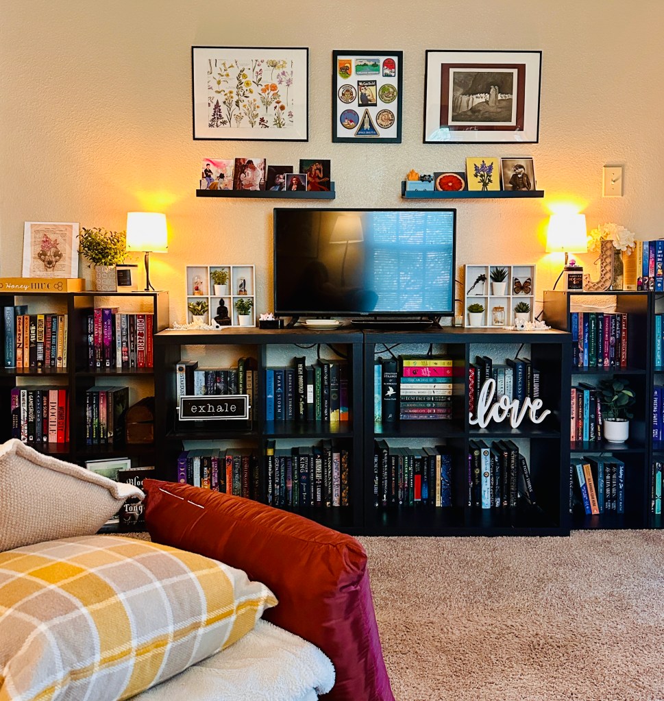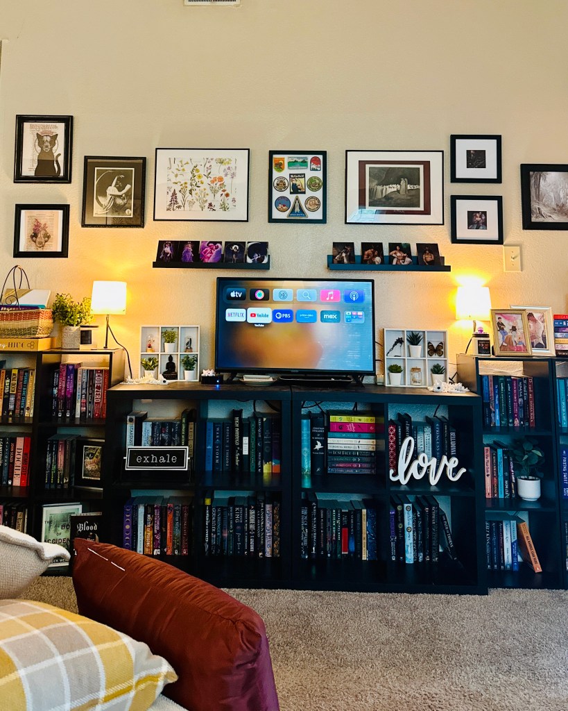 For a while, I was in a minimalist stage. Not a lot on the walls. The only thing I really collected were books. And while I am still minimalist-ish in some areas (like my clothes and general household items), I have gone back to embracing my need for art on the walls. I don’t like empty walls (for me). I want cozy. Lived in. A space that feels like a collection of all of my favorite things. These images are the process of creating a gallery on the huge wall that is above my bookshelves and TV. For the longest time, it was blank. Then, I added the IKEA picture rails and a few items I had in storage (the piece of poster with wildflowers of where I grew up, the patches collected on travels as a kid, and the book plate from Dante’s Inferno that I found in a second-hand bookshop in New Orleans).