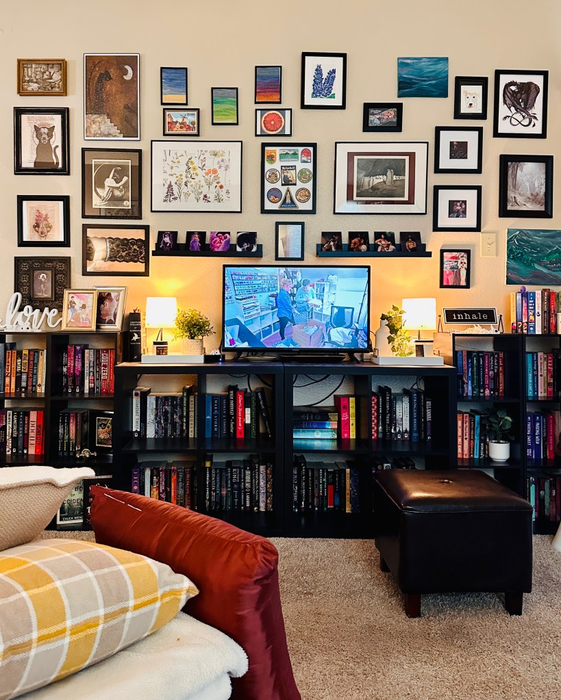 After going to the World Oddities Expo and finding new art, as well as pulling out some of the art cards I had received from book purchases/Patreon memberships, I went about getting frames from the thrift store and adding to the wall. And once I started, I had to get it full.