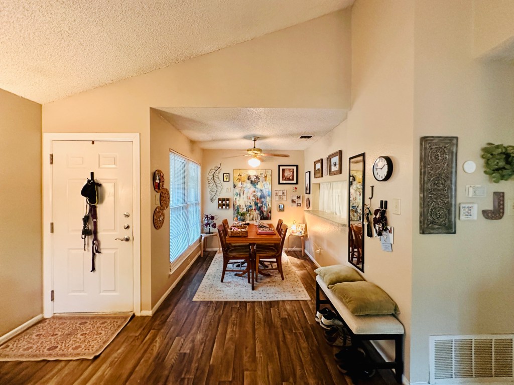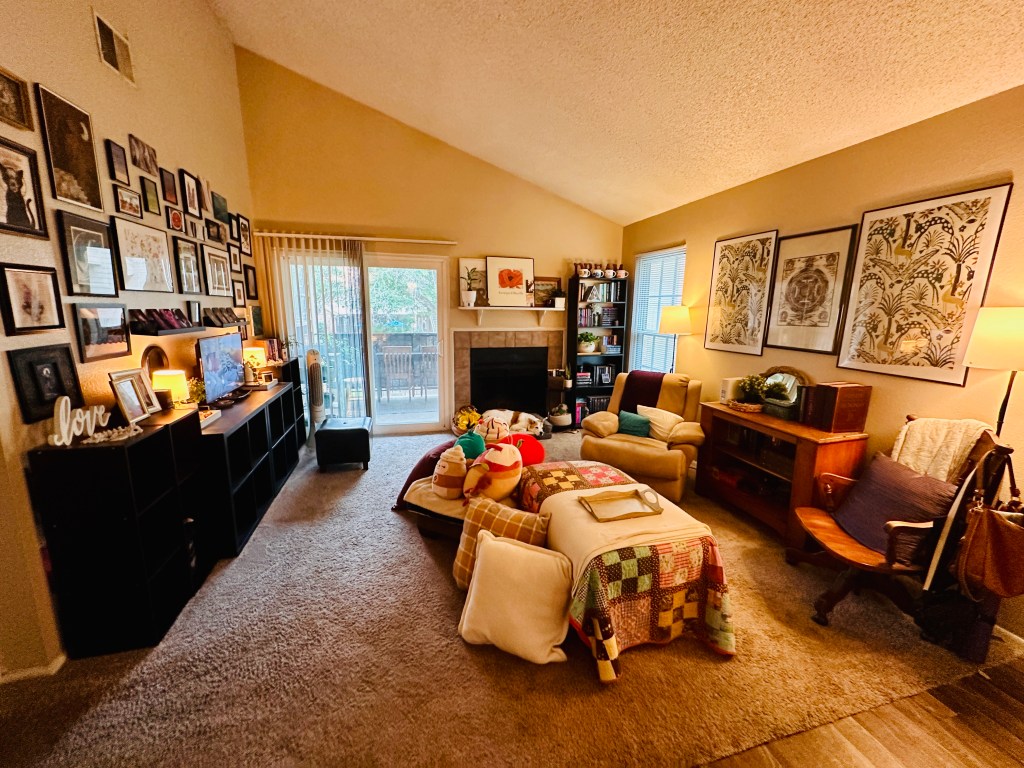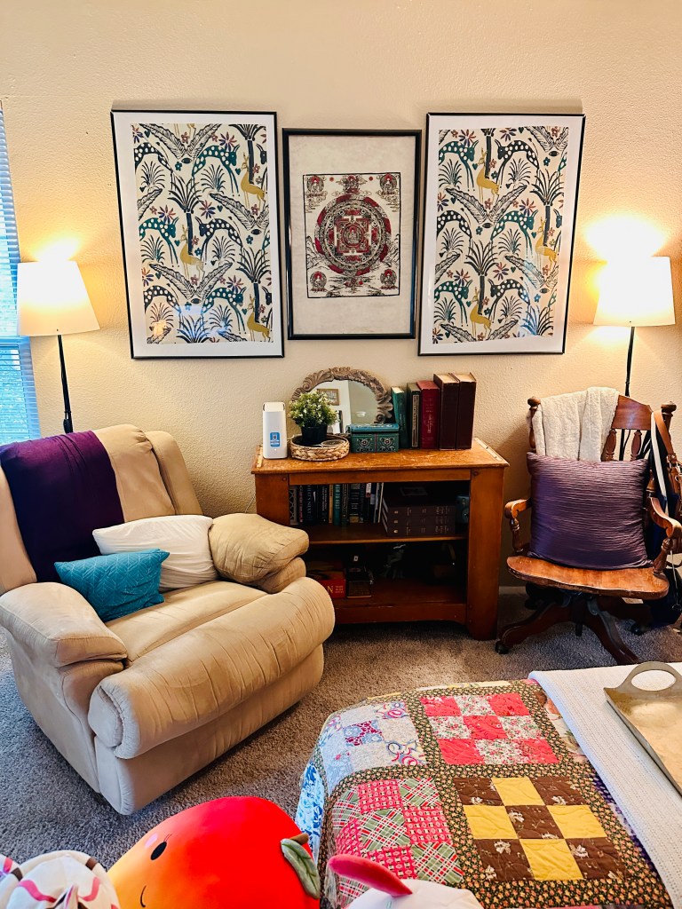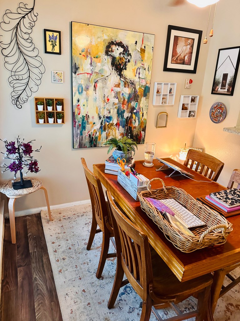 I dug out some of my own dabbles in artwork (acrylic painting). I found some simple items at the Dollar Tree to fill in gaps (mini canvases and mirrors). I found more art and postcards that I could frame. I also bought more thrift store frames and filled them with art cards and wrapping ribbon. It feels a bit haphazard, but it is also very much me. Random treasures to share and show off. I can always swap out what is in the frames if I find new art. I also have other wall space I can use. But this – this is me. Busy, but cozy. Lived in. Finally like home.