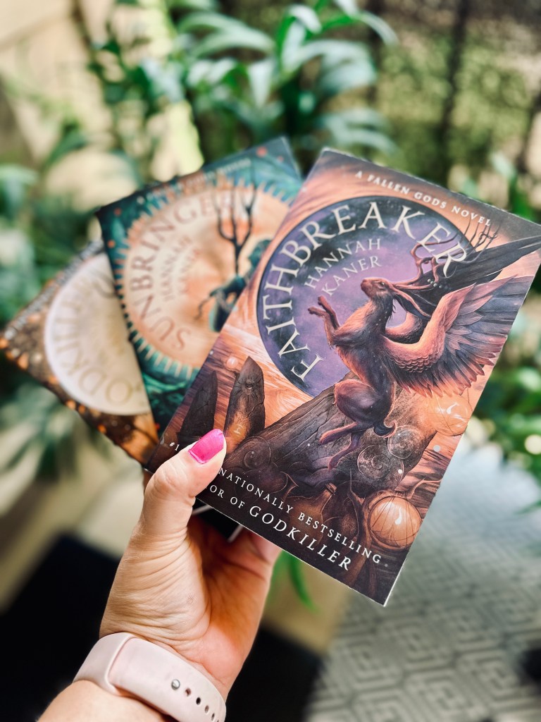 Hannah Kaner’s Fallen Gods trilogy — Godkiller, Sunbringer, and Faithbreaker — is a absolutely wrenching story of what it means to be a god and to love a god. What it means to become a god. And what it means to sacrifice yourself for gods and power.