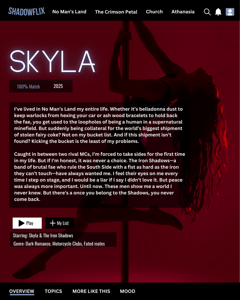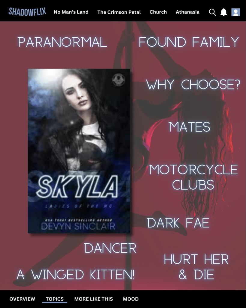 OK, as much as I am a down bad devotee of Devyn Sinclair’s omegaverse books, I am working my way through her paranormal ones as well. Point of No Return was great (Phantom of the Opera with gargoyles), and the Moon Enchanted series was also good (shifters and fated mates). The most recent one I came across was Skyla.