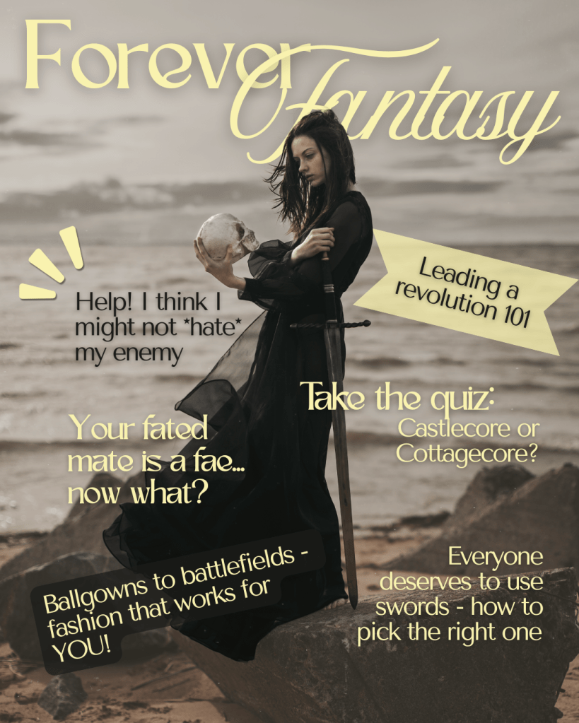 But, I had a hair to make a mock-up cover for a “fantasy magazine.” So I did it. And I kinda like it. Now, I also want to come up with mock magazine interviews of some of my favorite characters – like those old back-of-magazine pages where they have a list of favorites. Or maybe make covers for book reviews (like I do sometimes with my Netflix-style ones). This is the first time in a while where I felt even remotely creative, and I leaned in as much as time would allow.